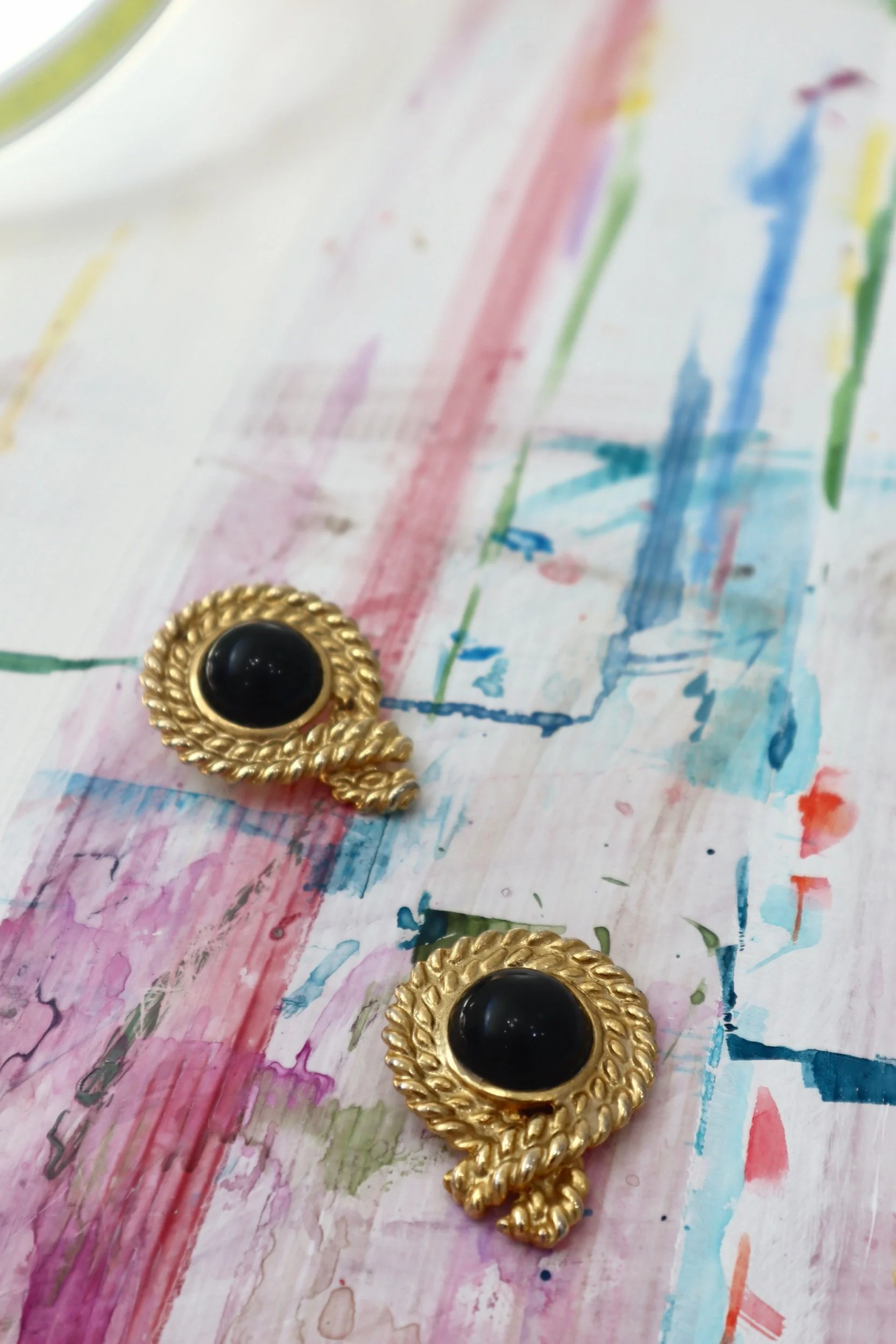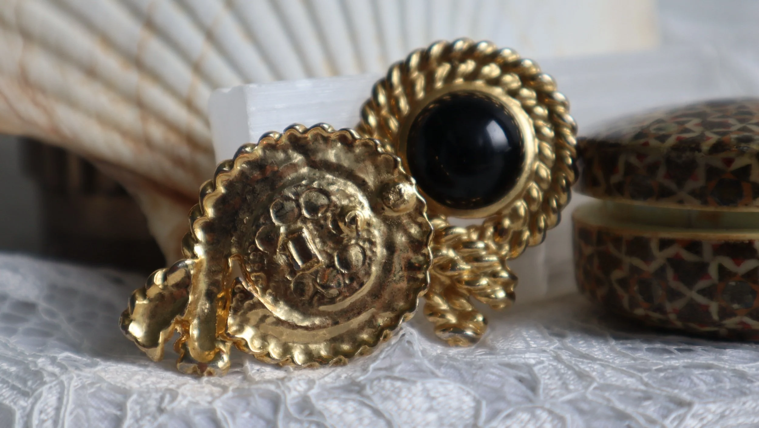 • Material: Gold-tone metal; black cabochon (likely resin)