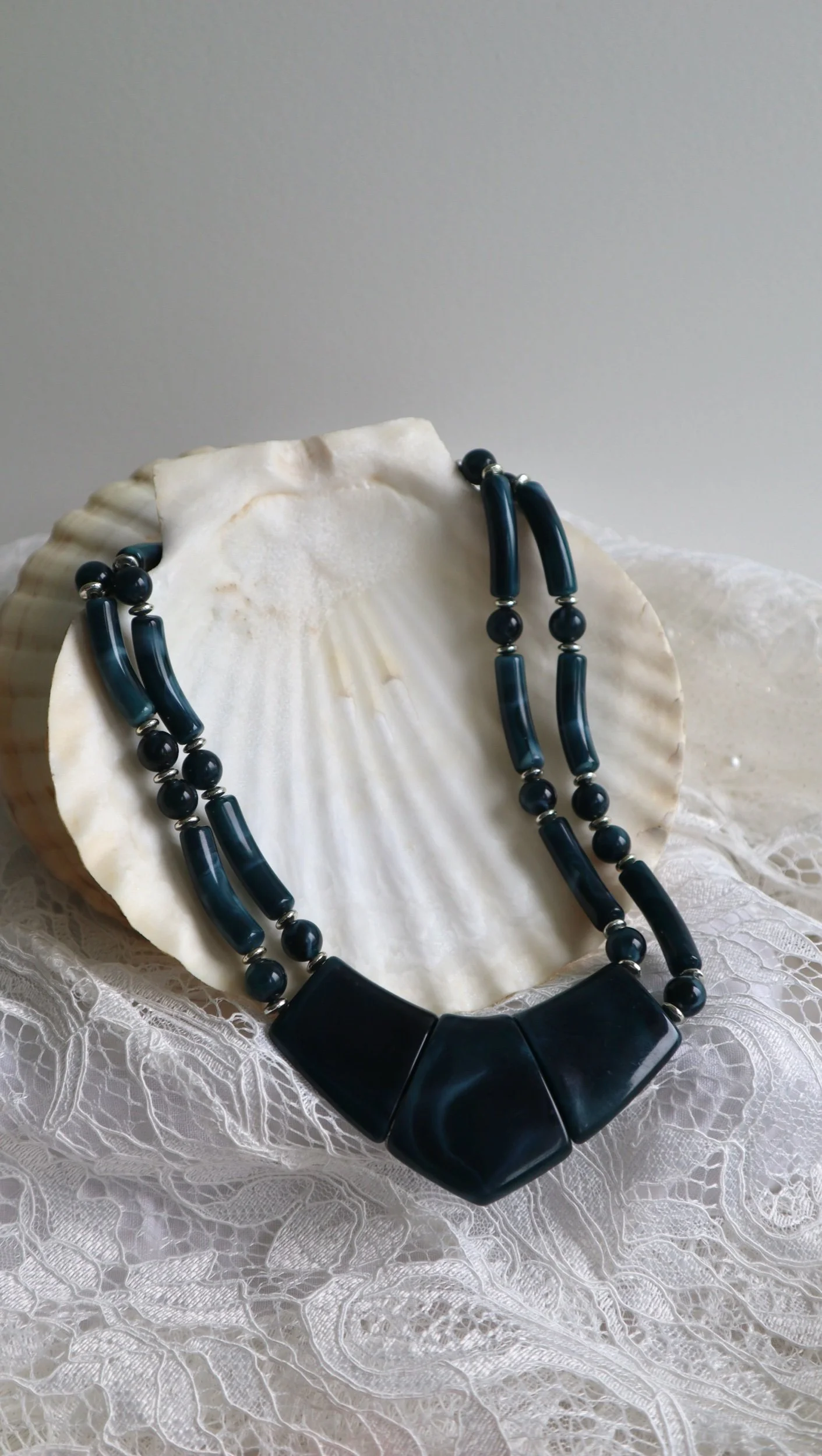 This vintage necklace composed of deep teal beads and elongated forms, leading into a three-part sculptural panel at the base. The shape sits wide across the collarbone, holding its line without dropping too low.